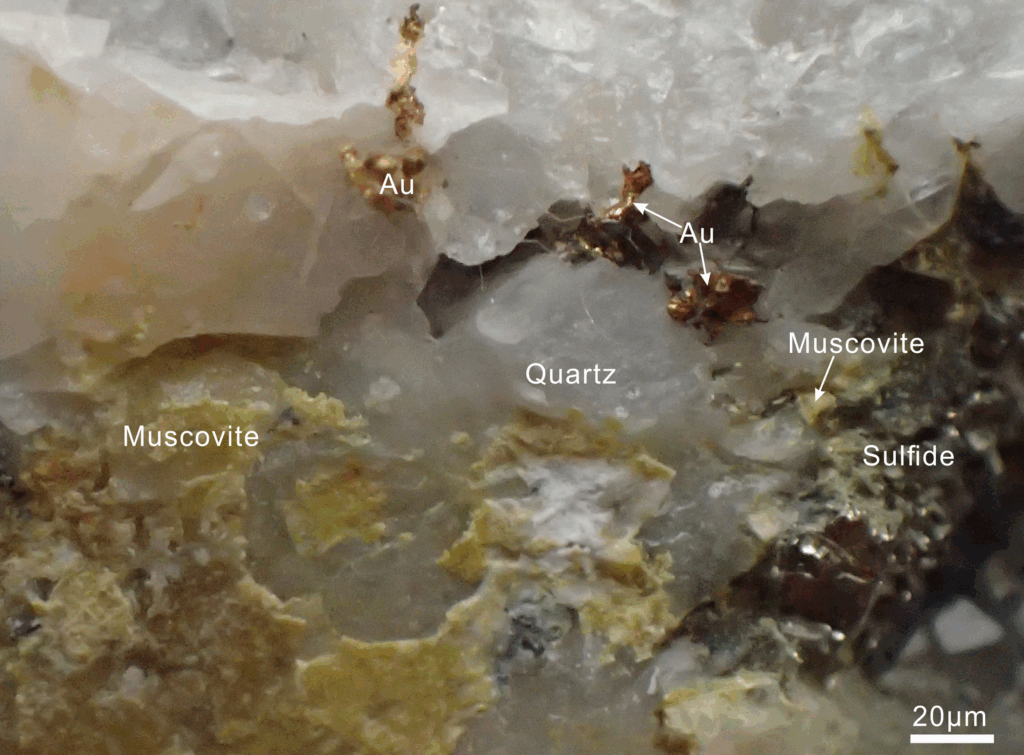 Coarse-grained native gold in quartz veins with presence of muscovite and sulfides
