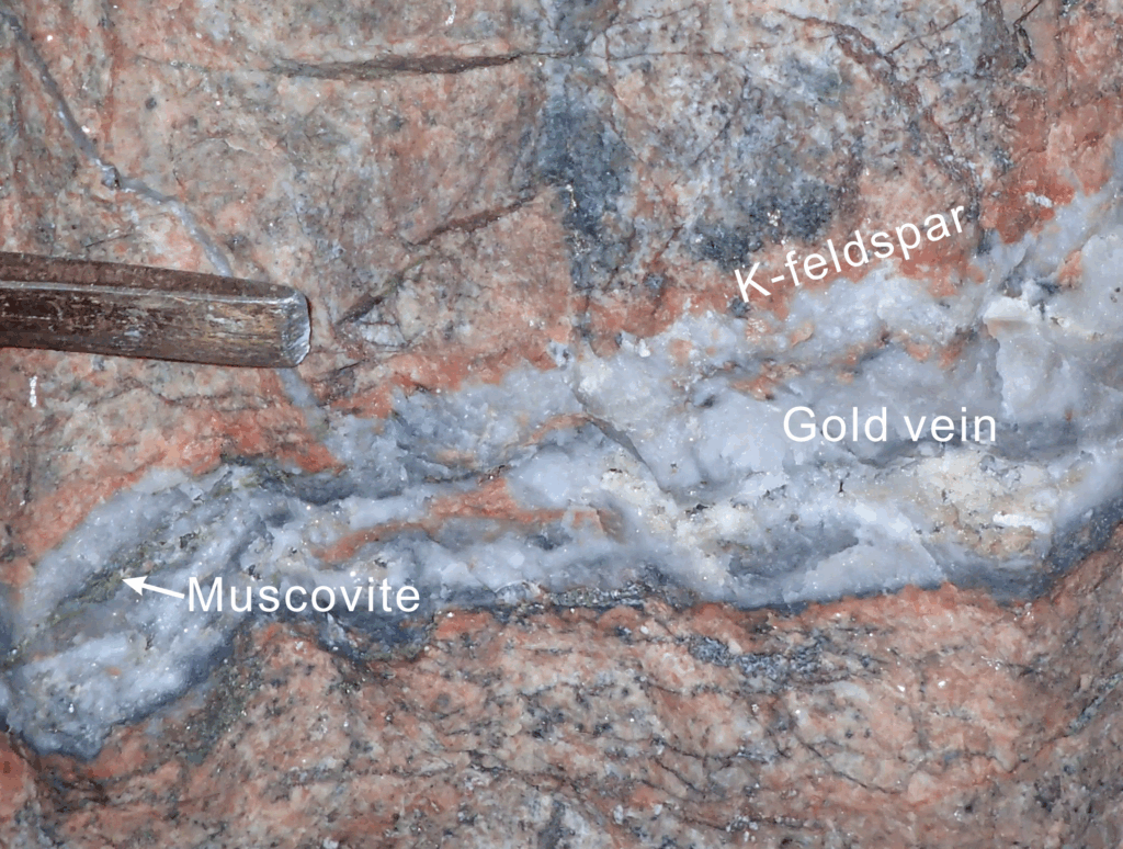 This phenomenon occurs when fluids containing potassium, sulphur and gold interact with surrounding rocks. Such alteration is easily visualised, often showing a light pink colour on a rock surface. It can be used as an indicator of nearby gold mineralisation.
