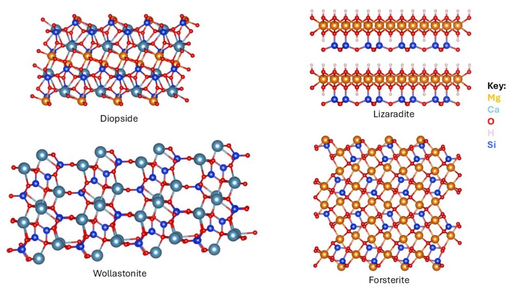 - Mineral selection: Wollastonite, diopside, lizaradite and forsterite chosen for their relevance to carbon mineralisation