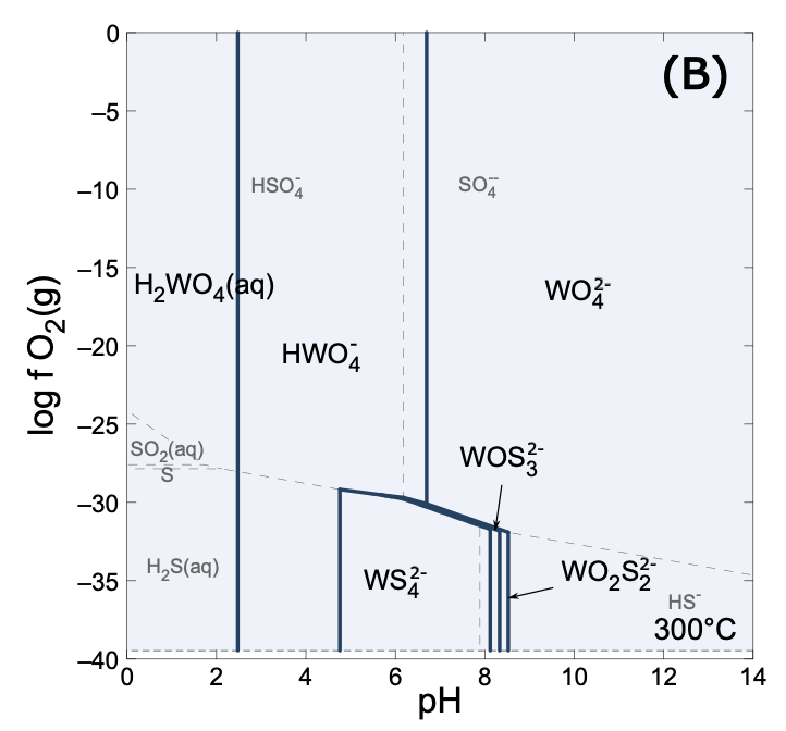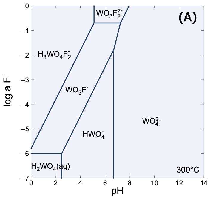 - Stability-field charts: pH–aF and pH–fO₂ at 300 °C, showing when tungstate, thiotungstate, or W–F dominate.