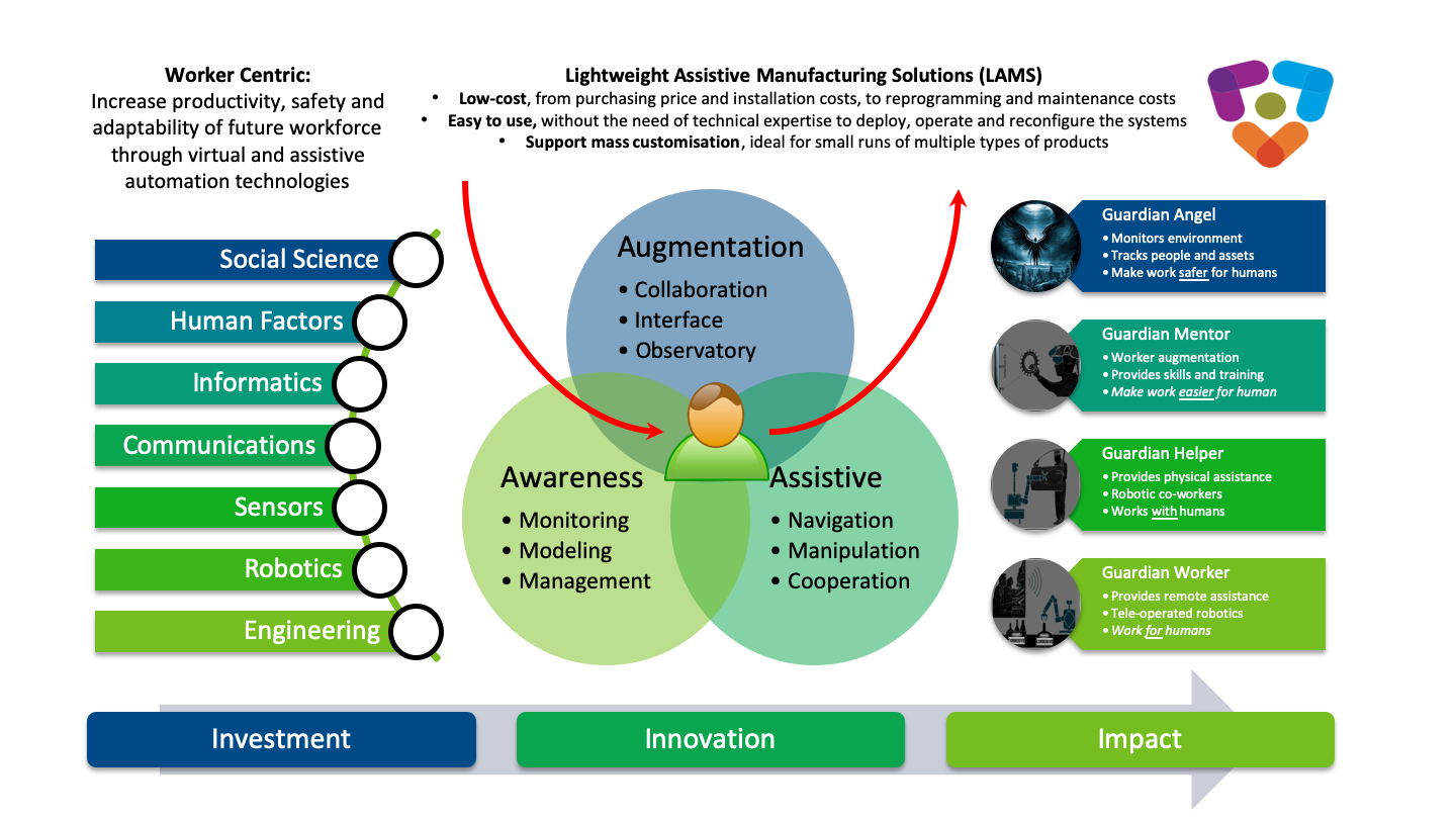 Guardian is achieved with the development and integration of a number of situational awareness and decision support technologies. Critical to the success of this technology is placing the worker at the centre of the research (see slide below) to develop appropriate Light-weight Assistive Manufacturing Solutions (LAMS). A proposed Guardian Testbed (Industry 4.0 testbed for mobile autonomous technology) was to be a node in the i3Hub network.