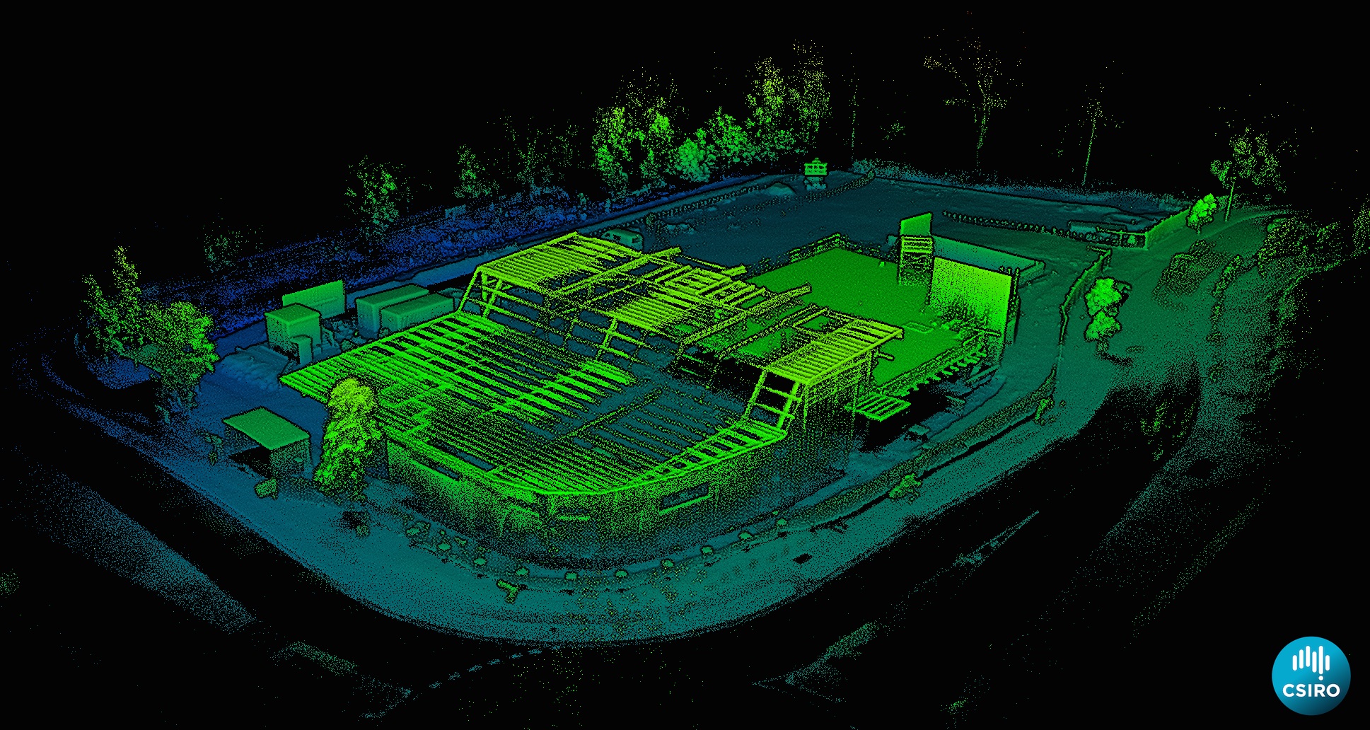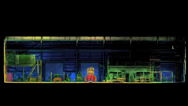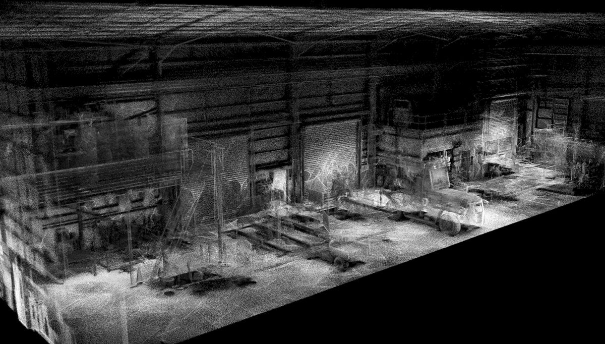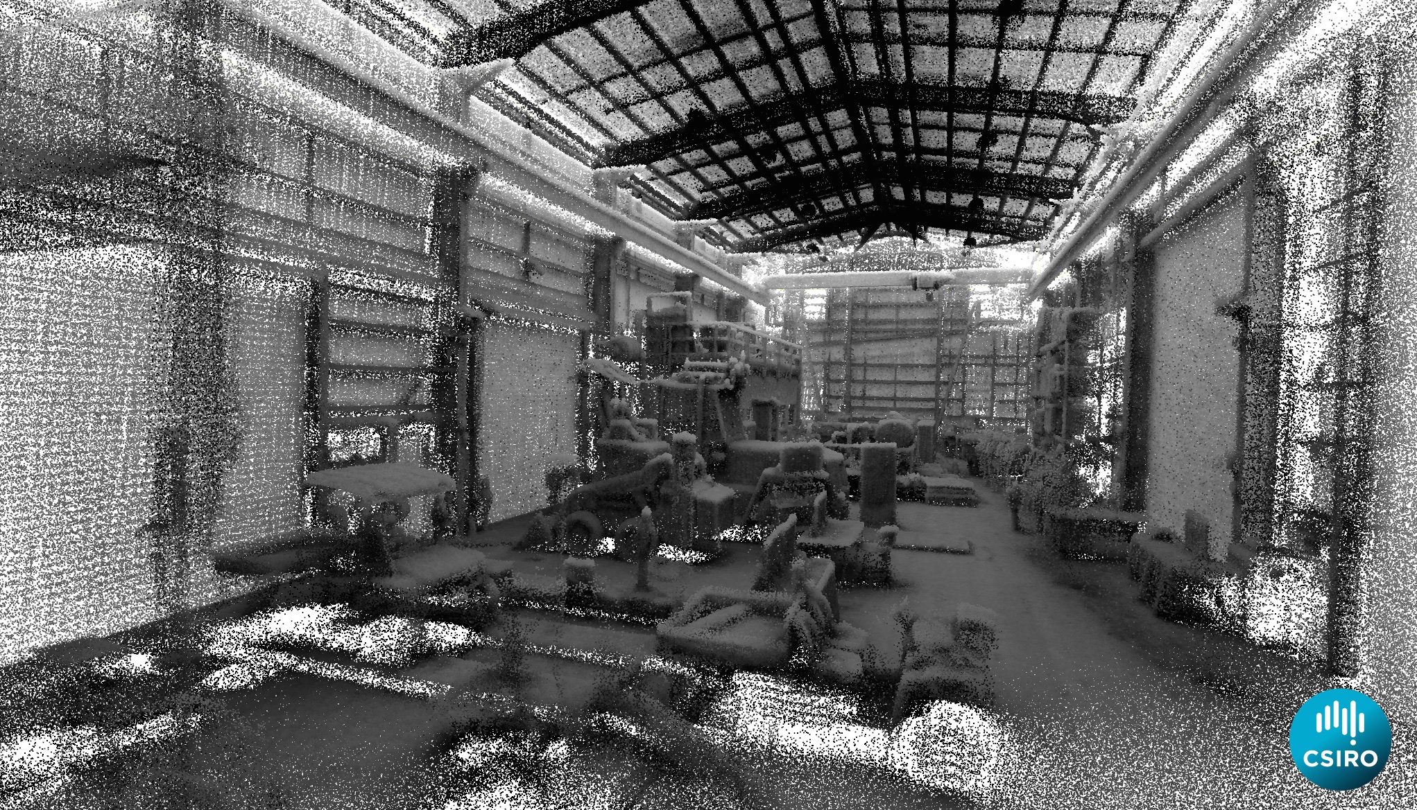 - A photograph of a warehouse area scanned at CSIRO by the Zebedee system