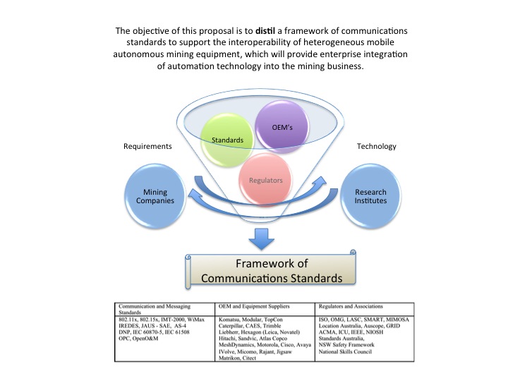 The communications infrastructure needs to have sufficient redundant capacity and automatic management processes so that local failures do not adversely affect productivity. All personnel and manned vehicles will need to be tracked, and if autonomous vehicles fail, they must “fail to safe”, so that zero harm is maintained at mine sites. The mines will need to take ownership of their ICT infrastructure. This means that OEMs/OTMs to need to “de-couple” the communications components from their systems. Furthermore, the mines will want to take ownership of the data and information created by the equipment (fixed or mobile) that is owned by the mine operator. Action. For the mining companies (who have a list of requirements) and the research institutes (who have an understanding of the technology) to distil from the OEM’s, the standards and regulatory bodies the SMA framework.